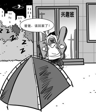据《都市快报》报道,每逢周末,浙江杭州少年宫的地上都会搭起很多帐篷,里面吃的喝的睡的装备齐全——很多学生早上、下午都在这里上兴趣班,为免去来回接送,让孩子中午能睡一会儿,有父母就把必需品都搬来,家长们在里面看书、玩手机、睡觉,等着自己的孩子。少年宫一位工作人员说:“帐篷可以搭,只要不搭在活动场地上、不影响交通。”