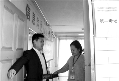 10月18日,一名参加党风党纪知识考试的党员干部(左)在考场内接受“金属探测仪”检测。