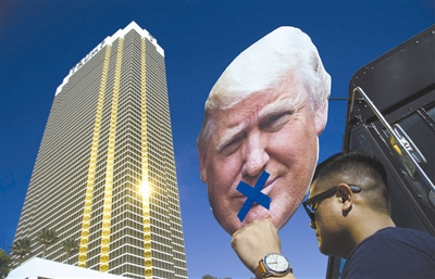 当地时间10月19日,美国拉斯维加斯,美国大选第三场总统辩论开始前,示威者聚集在特朗普酒店外,抗议共和党总统候选人特朗普。 东方IC 供图