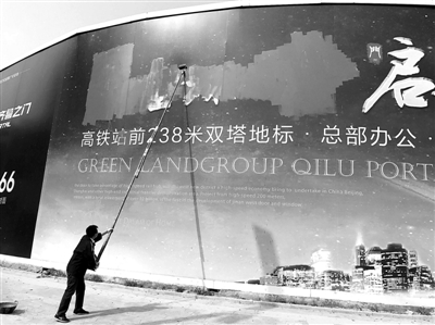 10月19日,山东济南日照路,一广告公司工作人员在粉刷巨型地产广告牌上的字体,将“全球”“地标”等词语用涂料遮盖,只留下地产名称和电话。