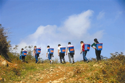10月22日,云南省昭通市大关县“背篼图书馆”工作队成员背着书走在前往悦乐镇新寨村海坝苗寨的山路上。