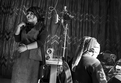 在裁缝铺内,图尔逊尼亚孜罕(左)在身上比划着她新近设计制作的一款连衣裙(10月12日摄)。图尔逊尼亚孜罕出生在新疆喀什巴楚县依肯乡阿拉尔村,从小便跟着村里颇有名气的裁缝学缝纫。2004年,新婚不久的图尔逊尼亚孜罕和丈夫来到乌鲁木齐打工。她自己开了一间裁缝铺,店内的服装做工精良,大多都是图尔逊尼亚孜罕亲自设计的。新华社记者 王菲 摄