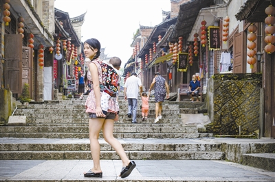 10月9日,贵州省黎平县长征历史文化街上,一位本地妈妈背着孩子走上台阶。1934年12月18日,中央红军长征途中曾在这条街的一处商铺中召开了著名的“黎平会议”。