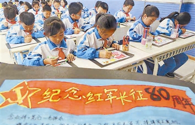 10月19日,河北省秦皇岛市,海港区先盛里小学学生绘制红色手抄报。曹建雄/视觉中国