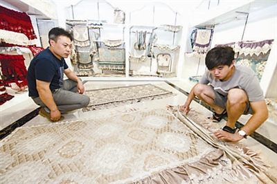 8月11日,河北省深泽县淘宝商户何金城(右)在叔叔何海军的布艺加工厂内挑选网销产品。