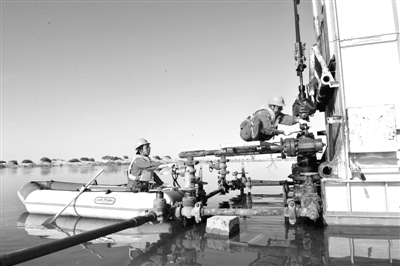 图为采油管理一区员工划着橡皮船保养清理采油树,不让一滴污油流出井场。