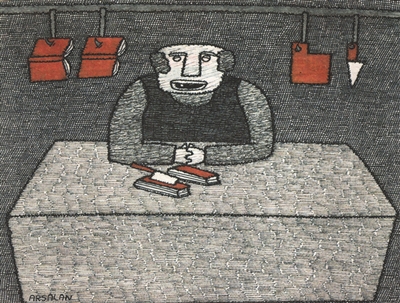这位先生的售货柜台其实是个书店,经营着“精神食粮”。方便读者的比喻尚可成立,但将书籍切块贩卖就显蹩足了。