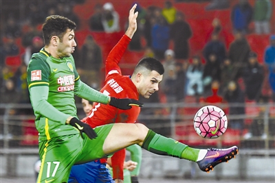 10月30日,北京国安在中超联赛最后一轮比赛中3比1战胜河南建业。图为北京国安队员伊尔马兹在门前拼抢。