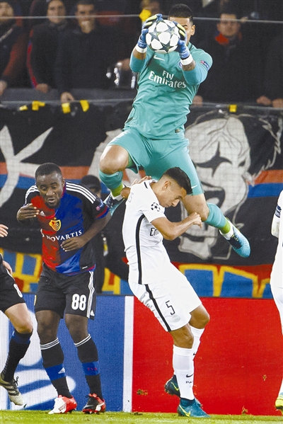 北京时间11月2日凌晨,在2016~2017欧冠联赛小组赛A组的比赛中,法国巴黎圣日耳曼队客场以2比1战胜瑞士巴塞尔队。另外一场引人注目的比赛中,英超豪门曼城坐镇主场3比1击败西甲霸主巴塞罗那。图为巴黎圣日耳曼队门将阿雷奥拉(上)在比赛中跳起扑救。新华社/美联