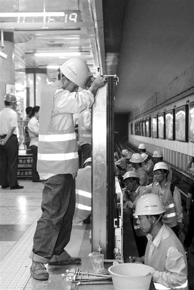 10月16日凌晨1时,北京地铁1号线永安里车站,中铁电气化局城铁公司的工人们正在进行屏蔽门固定安装。为保证白天地铁正常运营及行车安全,他们每天凌晨“跑步”入场,在3个小时内快速完成作业并及时清场恢复原貌。徐春子 陈龙 摄