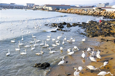 山东荣成自然保护区迎来大批越冬天鹅