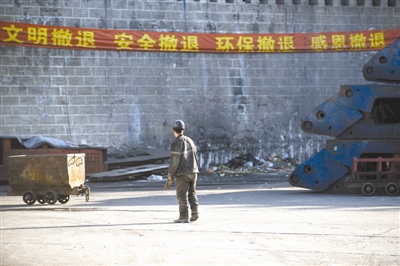 10月19日,同家梁煤矿8号斜井口,工人正在将井口关闭。这是今年山西省首批关停的煤矿当中生产能力最大的矿井,在册职工有4000余人。