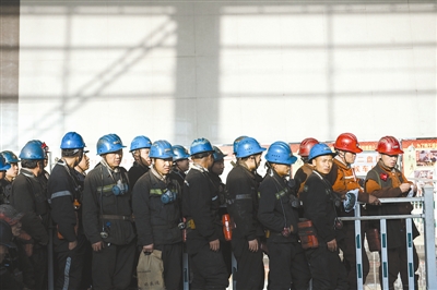 10月19日上午,大同塔山煤矿,从同家梁煤矿安置转移过来的职工们在等候下井。