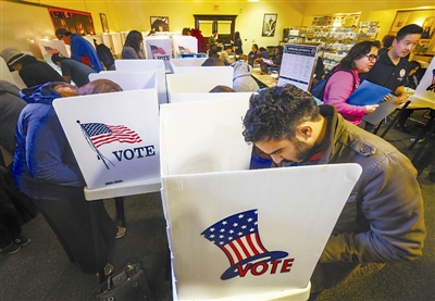 11月6日,在美国加利福尼亚州洛杉矶,选民在一处投票站填写选票。