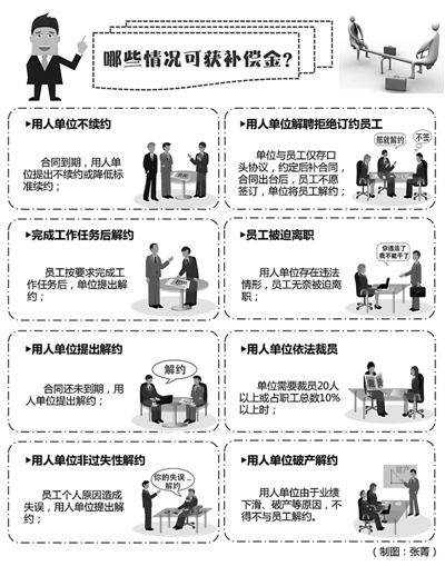 本报讯 (记者张菁)被解聘、被裁员、被迫离职……你是否经历过?离开用人单位时应得的工资和经济补偿金都拿到了吗?《劳动合同法》第四十六条明确规定了用人单位应当向劳动者支付经济补偿的情况。当你遇到下面这些情形时,先不要沮丧,记得讨回你应得的经济补偿金哦。