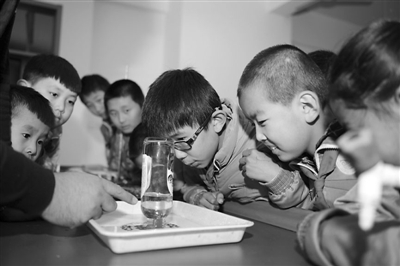 11月9日,孩子们在科普班上做蜡烛燃烧实验。为了让农村孩子能够享受丰富多彩的课余生活,河北省承德市营子区金扇子小学启动乡村少年宫建设工程,成立音乐、绘画、舞蹈、科普、体育等10多个兴趣小组。