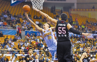 11月9日,深圳马可波罗队球员何忠勉(左)在辽宁药都本溪队球员韩德君的防守下上篮。