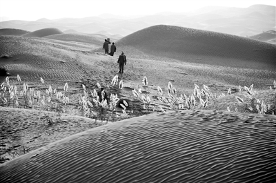 图为夕阳西下,测量员们加快脚步,想赶在天黑前回到集合点。