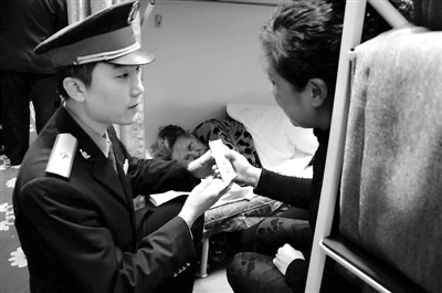 图为10月24日晚,该车队列车员向患病旅客家属介绍“重点旅客呼叫器”的使用方法。秦笑语 摄