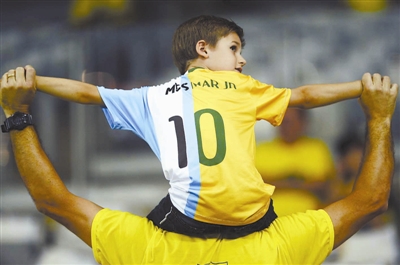 北京时间11月11日,世界杯南美区预选赛第12轮展开焦点战,巴西队主场3比0完胜阿根廷队,仍压过乌拉圭1分领跑。阿根廷队则连续4轮不胜,目前积16分仍居第6位,梅西近18次国家队出场首负。图为一名巴西小球迷身着印有梅西和内马尔名字的“合体”球衣亮相。视觉中国 供图