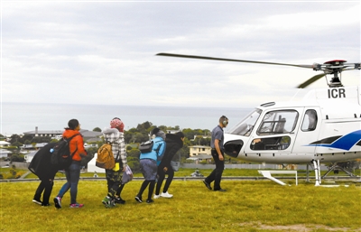 11月14日,在新西兰凯伊库拉小镇,地震受困游客准备乘直升机撤离。