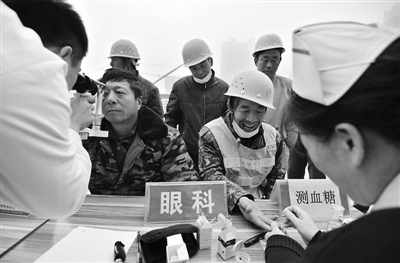 11月14日,河北省邯郸市第三医院组织医护人员到一处建筑工地开展“联合国糖尿病日”宣传义诊活动,为农民工免费检测血糖,并向农民工介绍糖尿病的预防和治疗知识,使更多的人了解糖尿病、认识糖尿病、战胜糖尿病,以此迎接11月14日“联合国糖尿病日”。郝群英 摄/东方IC
