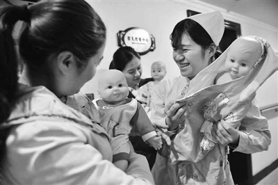 11月3日,河南省郑州市金桥宾馆,医护人员为妈妈们教授护理知识。金桥宾馆是郑州一家老牌酒店,随着公务、商务会议团体消费的下降,金桥宾馆谋求转型发展之路,盯准了月子市场这一潜在的巨大市场,开始走亲民路线。该酒店与郑州市妇幼保健院强强合作,开办了“妇幼金桥国际月子中心”。