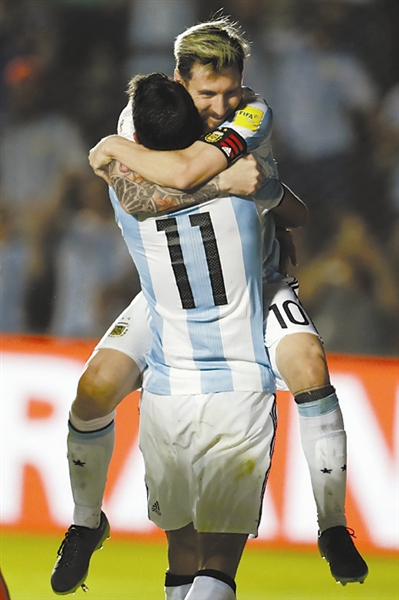 11月15日,阿根廷队球员迪马利亚(前)进球后与梅西庆祝。