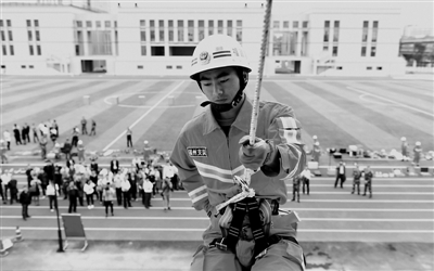 11月17日,在福州市公安消防支队综合训练基地,福州市公安消防支队特勤大队战士为培训班人员进行救援演示。