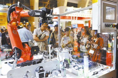 图为2016北京国际工业智能及自动化展上,观众在参观工业机器人手臂。麦田 摄/视觉中国