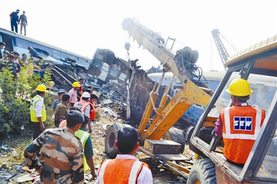 11月20日,救援人员在印度北方邦布克拉扬地区的火车脱轨现场工作。