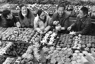 11月21日,山东省沂源县南鲁山镇成教中心的农技教师(右二)在传授花卉管理技术。