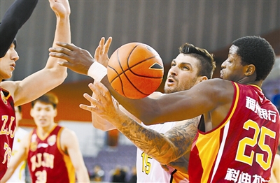 11月23日,在CBA联赛第10轮比赛中,北京农商银行以136比138不敌浙江稠州银行。图为北农巴蒂斯塔与浙江外援科迪在篮下拼抢。本报记者 许之丰 摄