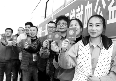 初冬时节,受连续低温影响,市民献血量减少,山东青岛市中心血站部分血型血液库存不足。青岛众多企业的爱心志愿者响应应急招募,来流动献血车无偿献血,让流动的血液温暖寒冬里更多需要帮助的人。图为青岛即发集团的爱心志愿者在流动献血车上献血后展示无偿献血证。梁孝鹏 摄