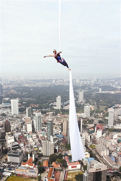 据外媒11月24日报道,南非女子卡莉在马来西亚吉隆坡塔305米处上演了一场惊险刺激的空中绸带舞,她先是在悬在空中的绸带上大秀特技,随后顺着绸带滑下,打开身上的降落伞进行跳伞表演,最后平稳落地。东方IC 供图