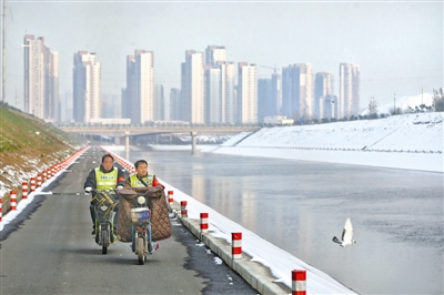 11月24日下午,在南水北调中线总干渠郑州段,贾军民(图右)和张盘柱两位师傅顶着寒风转场巡查。为了排查水渠隐患,保障输水安全,南水北调每一段水渠都有专人盯守巡查,用眼睛和仪器查找隐患,风雨无阻,他们称自己是南水北调干渠上的“钉子户”。