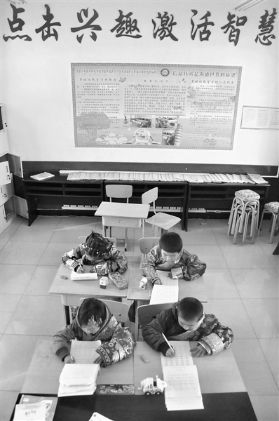 图为11月24日,在甘肃省天祝县抓喜秀龙乡代乾教学点,两名学前班和两名一年级藏族孩子在教室内上自习。甘肃省武威市天祝藏族自治县着力改善办学条件,让全县众多的藏族适龄儿童和少年得以就近上好学、读好书,力争“一个也不能少”。新华社记者 郭刚 摄