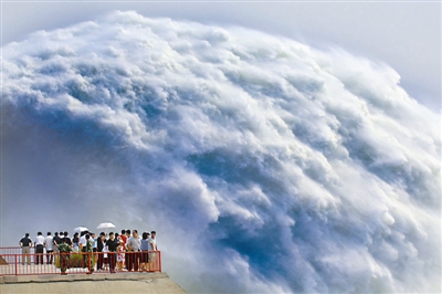 游客在小浪底出水口前感受“浪底云烟”的魅力(2006年6月18日摄)。