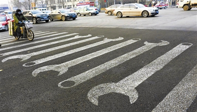 11月26日,沈阳市铁西区的个别路口,“工业符号”斑马线亮相。很多市民认为,这种斑马线更有区域特色,符合铁西区的历史特点。王禄皓 摄/东方IC