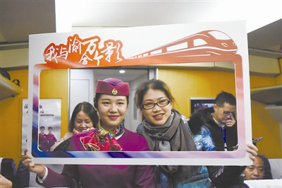 11月28日,一名乘客与列车工作人员在渝万高铁首发列车上合影。