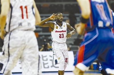 11月30日,在CBA第12轮的比赛中,广东东莞银行队主场以114比103战胜天津泰笛生活队。图为广东队球员斯隆在比赛中庆祝得分。 新华社记者 吴鲁 摄