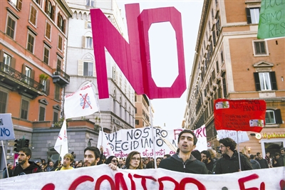 当地时间11月27日,意大利罗马,民众举行大规模示威,反对宪法改革公投,抗议政府和总理伦齐。 东方IC 供图