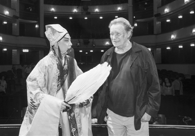 在奥地利城堡剧院,著名京剧演员于魁智(左)结束京剧《赤壁》的演出后,与当地演员交流(2012年7月1日摄)。