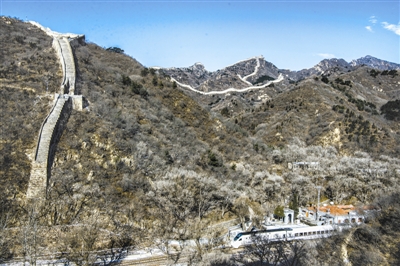 11月23日,一场小雪过后,一趟列车驶过位于八达岭长城脚下的青龙桥车站。