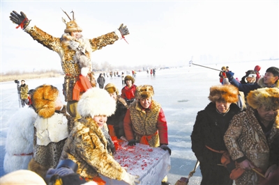 12月5日,在松花江哈尔滨段的江面上,民俗活动表演者在进行采冰表演。近日,松花江哈尔滨段开启“采冰季”,数以百计的采冰人在江面采冰劳作。 新华社记者 王建威 摄