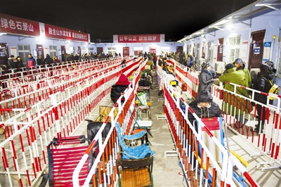 12月5日深夜,准备签约的市民在北京石景山区北辛安棚改项目签约处连夜排队。
