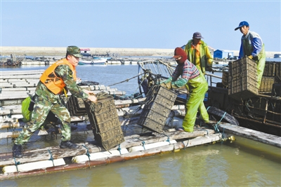 12月7日,在福建省莆田市石城渔港的渔排上,石城边防官兵协助渔民搬运从山东运来的鲍鱼网箱。
