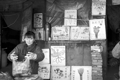 12月6日,甘肃省兰州市,在西固区西部市场里,有一位画画卖菜的胡大姐,用一幅幅蔬菜海报推销她所卖的蔬菜,十分有趣。
