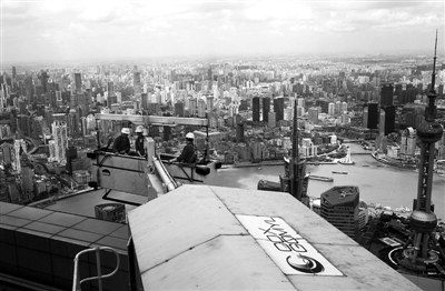 据上海一项调查显示,年底前不少高楼外墙需要保洁清洗。由于工作条件差和工作风险大,清洁外墙的“蜘蛛人”挣的是辛苦钱和风险钱,保洁公司高薪招不到工人的状况依旧存在。图为12月8日清洁工人在上海林立的摩天大楼间工作。潘索菲 摄/中新社