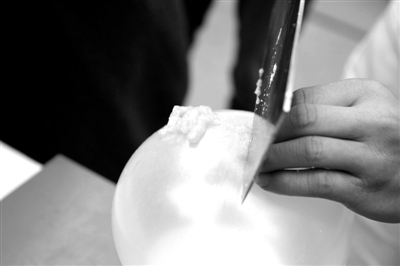11月30日,重庆,沙坪坝区2016年职业技能大赛决赛在三峡广场举行。 图为厨师在气球上切肉。